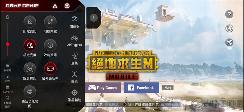 說到手機內建遊戲精靈之類輔助工具,那開山始祖應該就是 ROG Phone 系列了,這代的遊戲精靈(GAME GENIE)功能更強大更完整了,除了可以直接設定各種勿擾功能以外,手機溫度、處理器頻率、螢幕更新頻率、效能顯示、按鍵巨集、加速器(背景程式關閉)、錄影與AirTriggers 3 等功能都可在此介面中全部搞定,而且只要執行任何遊戲就會自動啟動,相當方便: