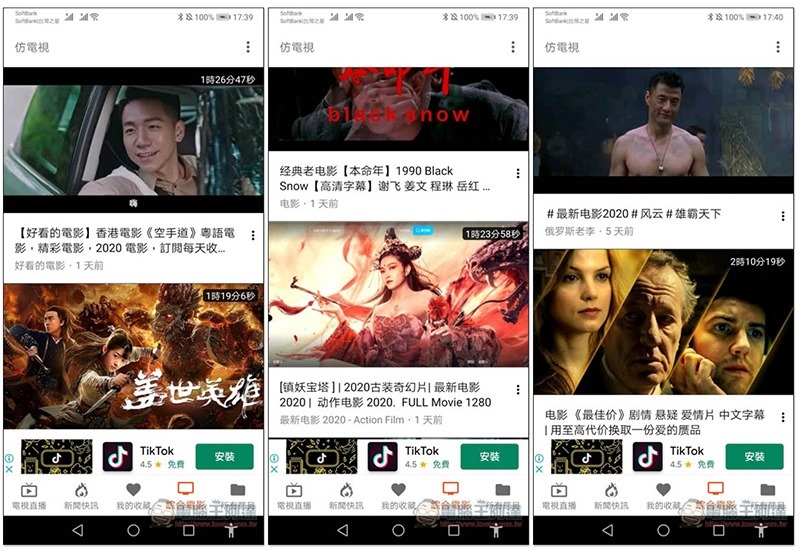 下方還有一個 “綜合電影” 選單,整理 YouTube 中完整電影的影片,這相當強大,不過可別以為能找到什麼強檔大作,基本上都是一些沒聽過的電影,大陸電影居多: