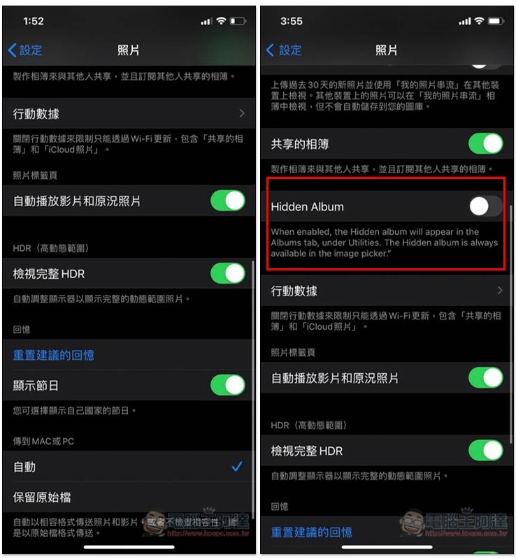 如下圖所示,左邊是更新前,右邊是 Beta 5,行動數據與共享的相簿中間,多了 Hidden Album 功能,預設為未開啟狀態,隱藏相簿不會顯示在照片 App 中,打開才會顯示:
