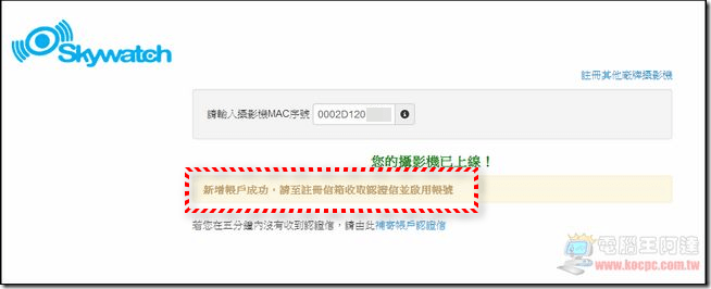 STEP5.執行啟動信中的「點此認證」,完成「Skywatch ProCam」攝影機的開通設定: