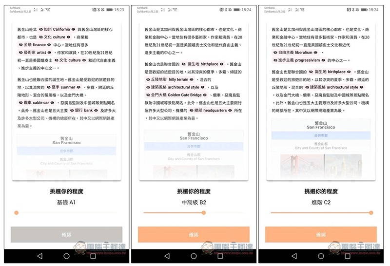 進入主畫面後,你會看到部分國內外文章的標題和內容,有英文單字和中文解釋,這是這款 App 的 AI 推薦功能,自動挑選符合你英文程度的單字:
