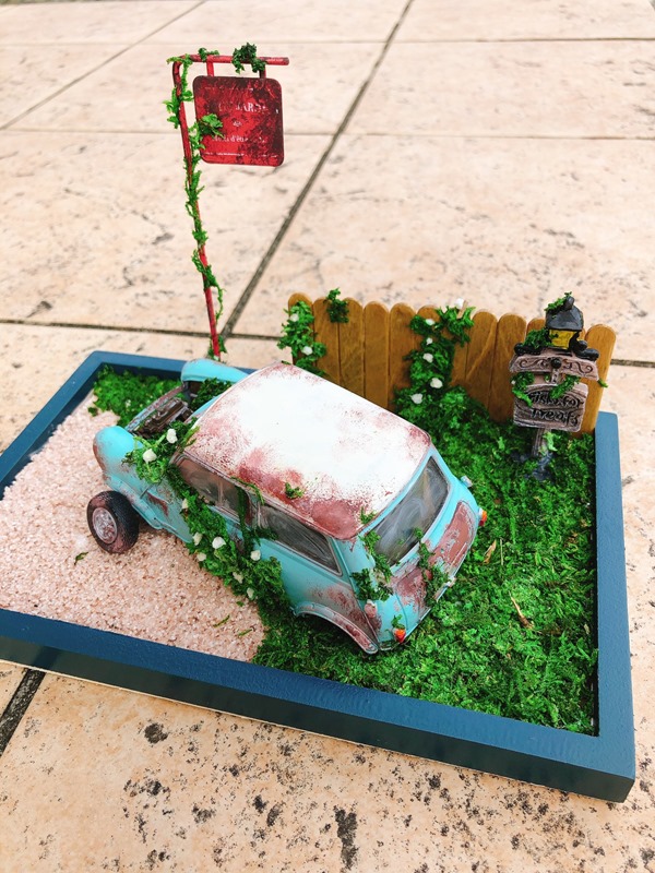 首先她先把分離的車子底盤與車頂黏起來,然後噴上顏料,讓外觀看起來有一定歷史年份,還搭配咖啡色呈現生鏽的感覺,接著再放上假草,而且是從牆壁延伸到地面、車身,呈現一種這台放在這裡很久的感覺: