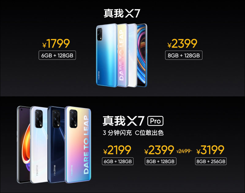 最後則是大家關心的售價, realme X7 起售價為 1,799 元人民幣(約合新台幣 7,670 元),而高階的 realme X7 Pro 最入門的 6GB+128GB 版本只要人民幣 2,199 元(約合新台幣 9,375 元),以這規格的 5G 旗艦手機算是相當超值!