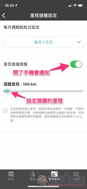 這個功能可以在 App 底部的「騎乘資訊」的標籤頁中找到 — 按鈕其實蠻低調的以灰色,放在了本週期里程顯示的一旁。點入之後就可以透過設定頁面選擇里程提醒的週期(通常與你的月租計價週期一致),然後能夠在底下選擇希望提醒的里程數以及是否要推播通知。底下就是小編設定為 100 公里收到的通知。