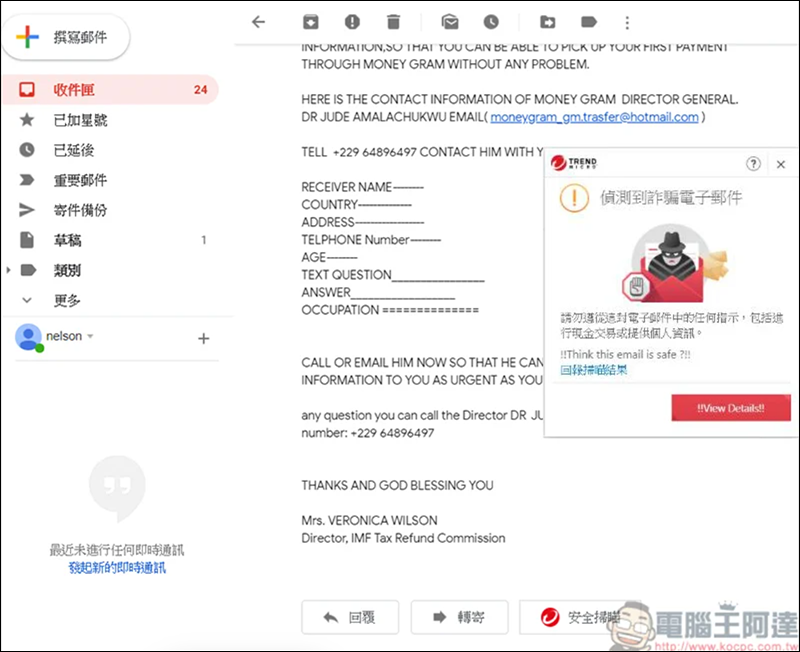 - 防範詐騙郵件:能即時偵測詐騙郵件(Gmail、outlook.com),並提供警告訊息,不僅可以偵測惡意網址,更運用PC-cillin 獨家的 AI 技術分析詐騙郵件與連結,並針對郵件特徵予以警示 。