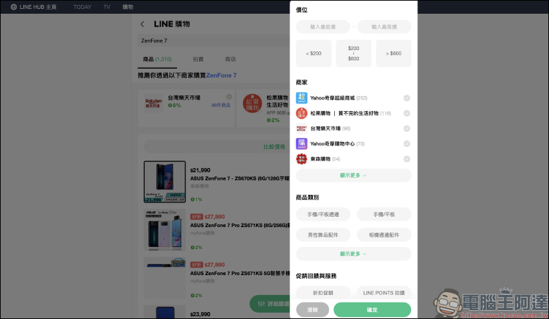 說到 LINE HUB ,筆者最愛的其中一項功能就是它的搜尋引擎了。以往市面上其他入口網站或搜尋引擎往往是在輸入關鍵字後,還得在雜亂的搜尋結果中尋找實用的內容。若想進一步購買商品,還得另外再自行比價格、比回饋,但是在 LINE HUB 只要輸入想查詢的關鍵字並按下搜尋按鈕這麼簡單。這裡就以最近熱門的 ZenFone 7 當關鍵字進行示範囉!