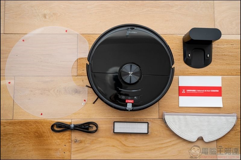 開箱,S6 MaxV 配件包括了掃拖機器人本體、充電底座、說明書、拖布支架、防水墊與電源線等等: