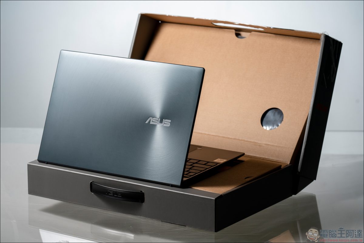 這次要帶來開箱的是象徵寧靜與平和感受的綠松灰色,這個顏色大約落在銀灰與鐵灰之間,一般讓人感覺比較冷硬的灰色,這次卻因為帶有一些些暖色調,而顯得沉穩中蘊含光澤,這次 ZenBook 將經典同心圓髮絲紋中心點移至上蓋側邊,充滿禪意的同心圓讓整體畫面看起來不會單一顯得呆板,而且還彷彿銀河般圍繞中心 ASUS LOGO閃爍著。放進盒子裡與外盒相得益彰,更能彰顯出筆電背蓋閃爍禪意的光線,讓人忍不住凝視著視覺中央