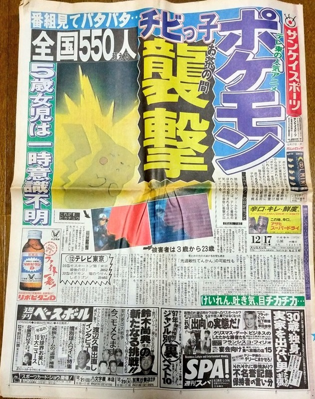 過去日本動畫經常會以不同顏色交替閃爍的方式,來呈現爆炸場景,這不僅效果很不錯,也能節省製作成本,而精靈寶可夢第 38 集中就有這麼一段。於 1997 年 12 月 16 日日本電視播出,不少孩童看到之後,出現眼花、頭疼與噁心的症狀,嚴重者甚至還出現失明、抽搐和昏迷,當時日本各大報還以頭條的方式報導(圖片來源):