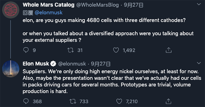 對此,Elon Musk 選擇在針對會開發幾種鎳比例電池方面的問題,先回覆了目前 Tesla 僅會自行製作高能量密度的版本。然後順便澄清(實為偷爆雷 XD),其實特斯拉早已將最新的 4680 電池放在車輛上實測「數個月(Several months)」。雖強調進入量產才是真正的難關,但這個小爆料也讓大家對於新電池可能會用在哪些車款上有了想像。