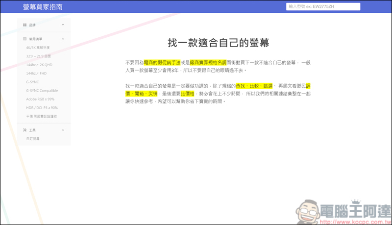 前陣子挑選電腦螢幕的時候,真的是做了十足的功課,光找一台2K、144Hz、IPS面板的27吋螢幕,網頁分頁都開爆了,更別說還得一頁一頁地細看規格,相當麻煩!好在剛好看到這個螢幕買家指南頁面,真的幫我省去許多麻煩,只要輸入螢幕型號,或是針對你需要的規格直接搜尋,頁面就會自動地幫你把符合規格的電腦螢幕列出,而且還能同時列出三款螢幕規格,更好用的是,PTT、Mobile01、巴哈姆特這三個平台只要有鄉民開箱的文章,還會幫你整理出來,讓你省去不少找資料的麻煩: