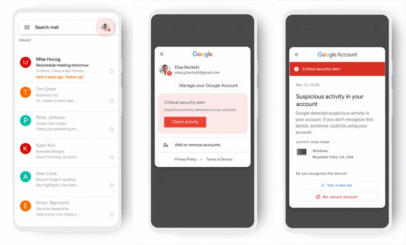 當個人帳戶安全受到威脅時,如何在第一時間做出反應將損失降至最低是至關重要的問題,偏偏有很多時候危險都是在無形中接近,多年來 Google 已經開發出用新的方式來通知用戶問題的出現,並且致力於改善用戶的帳戶安全性,現在 Google 將導入重新設計的危急警報和新的警示方式。當 Google 偵測到使用者的 Google 帳戶暴露在嚴重的安全問題下,系統會自動在目前所使用的 Google 應用中顯示警報,無須開另外開啟郵件或手機的警報,並且為用戶提供協助。新的警報系統由於內建於 Google 應用中,因使你不必擔心是來自詐騙份子的釣魚信件,未來幾周內將會開始進行區域推廣,計畫在明年初能夠普及發布。
