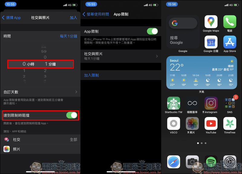 在這步驟要設定指定 App 鎖定的時間,這裡將時間設為「每天 1 分鐘」並將「達到限制時阻擋」開啟。設定完成後, App 限制清單會顯示目前有鎖定的 App 。返回主畫面就能發現,被限制(鎖定)的 App 都轉換為反灰的外觀,在 App 名稱旁則有螢幕使用時間的圖示標記: