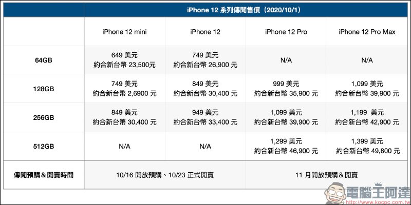 - iPhone 12 Pro(6.1 吋):10 月 16 日(或 10 月 17日)開放預購,10 月 23 日(或 10 月 24日)正式開賣