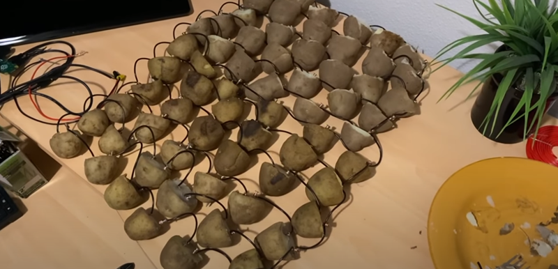 而這一堆馬鈴薯可產生約 3.7v,換算之後每半顆馬鈴薯僅提供不到 1mA 的電流,非常少,意味著他需要更多馬鈴薯,經由計算大約需要 770 (半)顆才夠,這樣他就能獲得 100mA 的電流,以及約 ~4.5V: