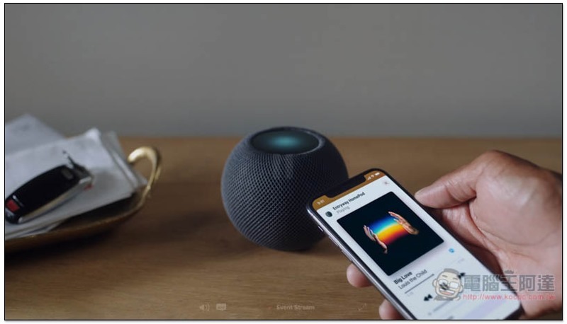 也具備 U1 晶片,iPhone 靠近 HomePod mini 之後,音樂就會自動改由 HomePod mini 播放,無需操作任何功能。Apple 也預告,今年稍晚會有更進一步的提升,如:聲音轉移時會發生各種音效、視覺與觸覺的回饋效果: