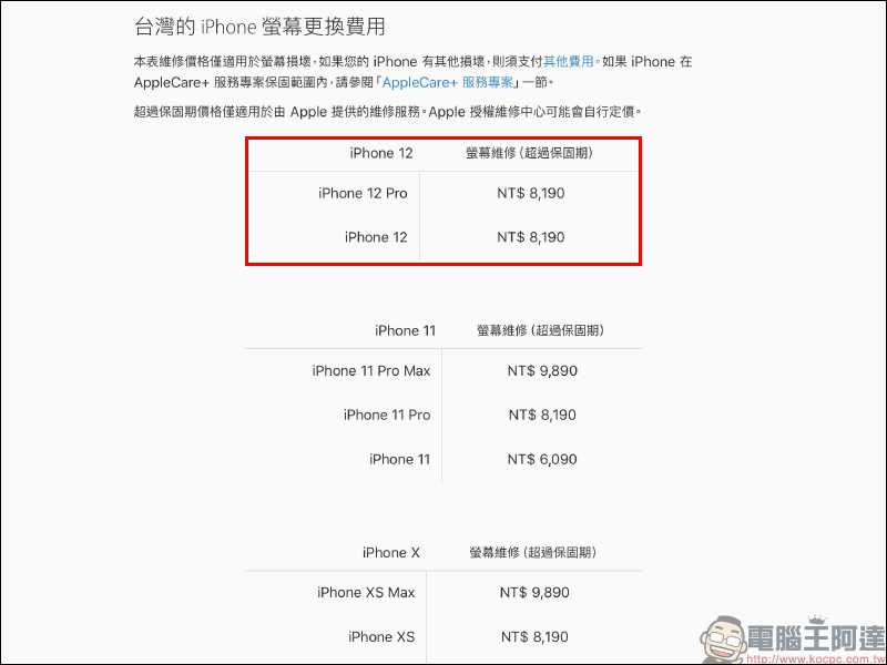 近日 Apple 台灣官網也公布 iPhone 12 系列螢幕維修的費用,目前僅公佈兩款 6.1 吋機型 iPhone 12 和 iPhone 12 Pro 的螢幕維修價格皆為 NT$8,190 ,這價格與 iPhone 11 Pro 和 iPhone XS 螢幕維修價格相同,但相比過去都是 LCD 面板的 iPhone 11 或 iPhone XR 螢幕維修價格 NT$6,090 ,不意外還是貴了一些。