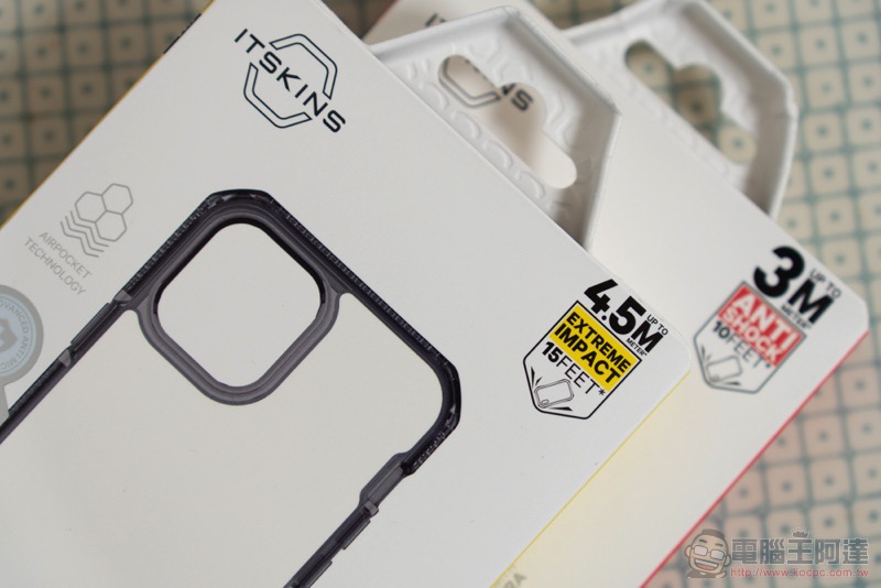 這次我們體驗的 ITSKINS 保護殼共有四款,主要依防摔能力可以分為 3 公尺強力防摔與 4.5 公尺超越軍規 810G 的極限防摔兩種等級: