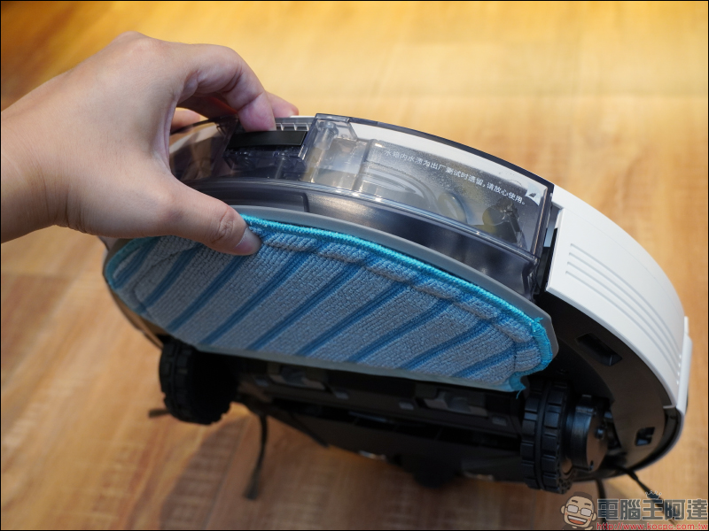 ECOVACS N8 提供可重複水洗的拖布和與知名品牌合作特製了一次性的除菌拖布,拖布採用拆裝都相當容易的魔鬼氈固定。將拖布安裝在拖布支架後即可安裝到水箱上。