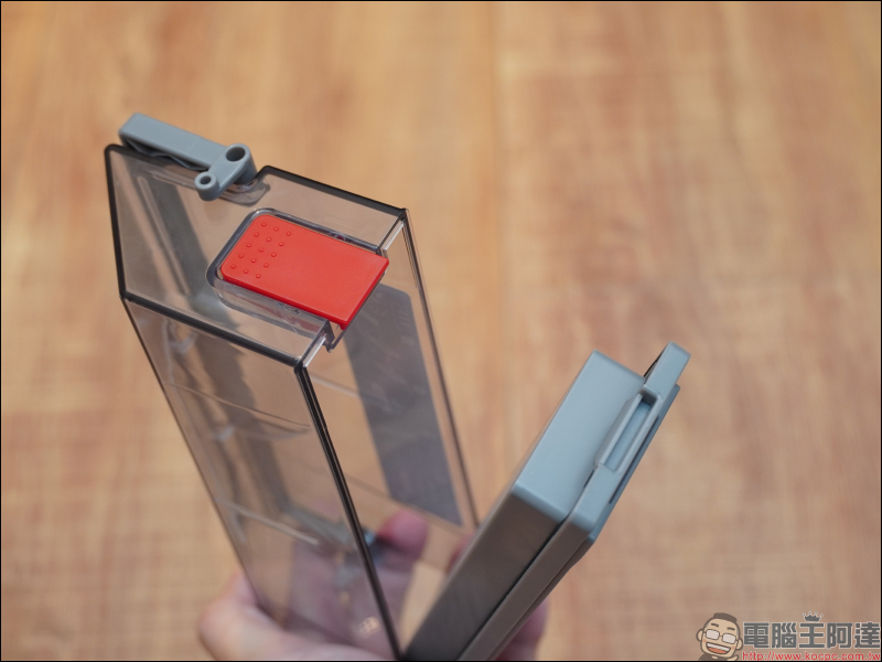 要倒除塵盒內的灰塵、垃圾相當簡單,只需按下集塵盒側邊的紅色蓋子即可將集塵盒開啟: