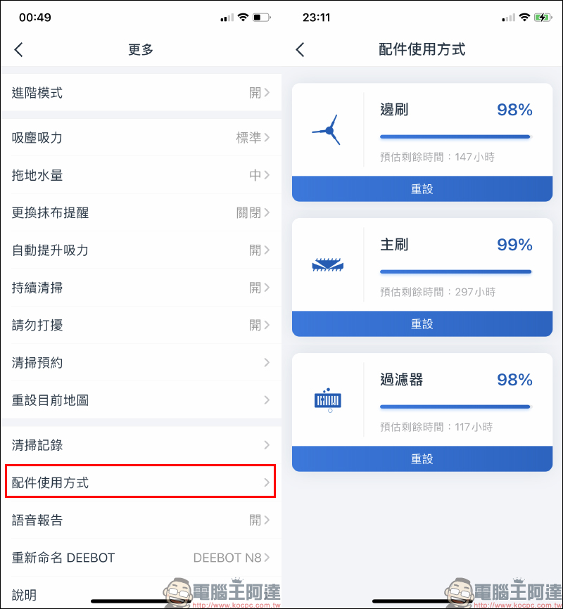 倘若不知道何時該更換配件,也能從 ECOVACS App 的「配件使用方式」進行查看,在 App 會顯示包括邊刷、主刷以及濾網的預估剩餘使用時間。