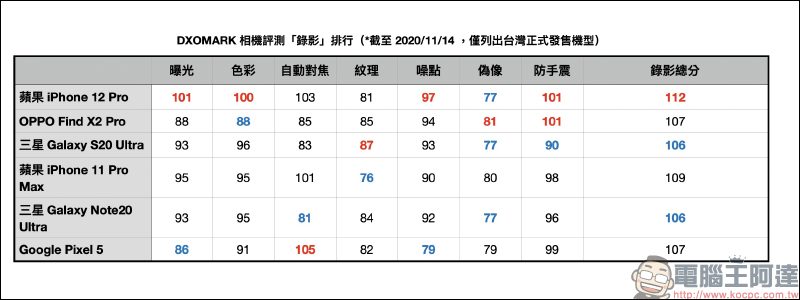 (延伸閱讀:iPhone 12 Pro 開箱+實拍體驗:熟悉的它與「各種 Hi Speed」)DXOMARK 公布 iPhone 12 Pro 相機評測成績:極好的錄影表現,總分 128 分、拍照 135 分、錄影 112 分 - 電腦王阿達