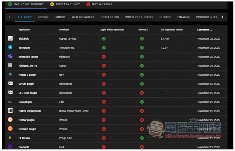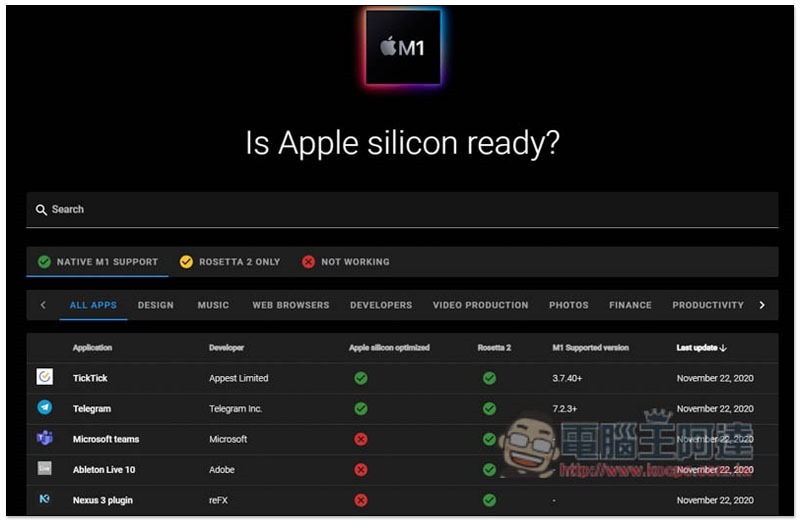 這次新款 Mac 系列的 M1 晶片,因為變成 ARM 架構,因此大多 x86 應用程式目前都還不支援,雖然 Apple 有製作一個 Rosetta 2 編譯器,讓用戶可以把 x86 應用程式轉換成 ARM 程式碼,不過畢竟不是原生支援,相容性與效能還是有差,再加上也不是每一套應用程式都能轉換,對於想入手 M1 版 Mac 系列的朋友一定覺得很亂,到底自己常用的應用程式是否支援了?可不可以透過 Rosetta 2 轉換?為此,國外就有網友打造「Is Apple silicon ready?」網站,整理各類應用程式現今對 M1 的支援性如何,方便大家快速查詢。