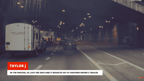 ▲圖:另一支載著沙發還直角衝下交流道的「甩掉沙發」影片,也讓人覺得像在拍電影…(來源:Wham Baam Teslacam)