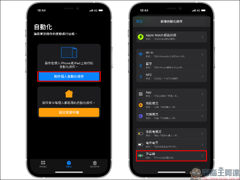 接著要開始製作 iOS 的個人自動化操作,首先開啟「捷徑 App」並切換到「自動化」頁面後,點選「製作個人自動化操作」,接著在新增自動化操作選擇「充電器」: