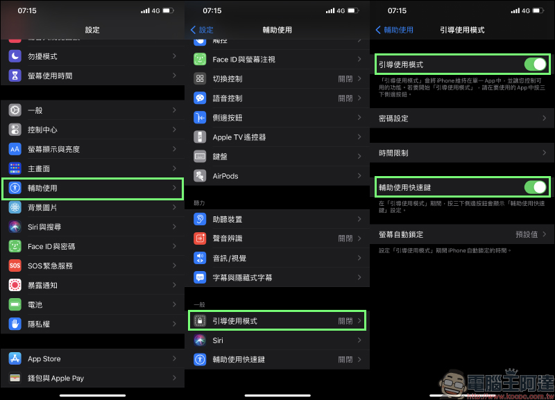 首先,前往「設定」選擇「輔助使用」,接著點選「引導使用模式」進入下一頁,再來將「引導使用模式」和「輔助使用快速鍵」這兩項設定開啟。在畫面上也見到「密碼設定」選項,不過即便這階段不設定密碼,之後首次開啟也會自動彈出密碼設定畫面。