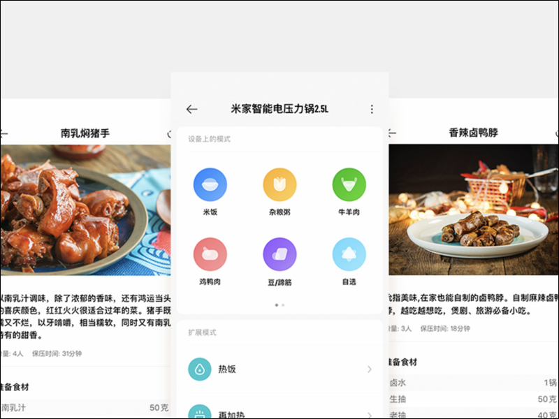 對於不知該用米家智能電壓力鍋2.5L 煮什麼的料理新手,也能根據米家 App 的食譜準備材料、進行一鍵烹煮,用戶也能在手機遠端遙控電壓力鍋,在返家後立刻能享用料理。