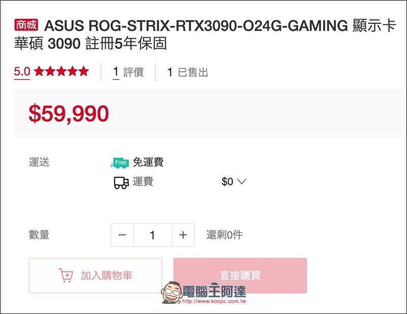▲這張顯卡的台灣售價約 59,990 元。重要的是它目前似乎在缺貨,許多網頁均已掛上補貨中字樣