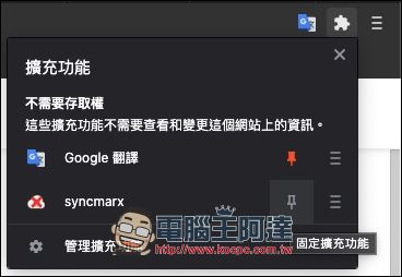 ▲安裝好以後就可以點拼圖圖案的按鈕呼叫出擴充功能選單,找到 Syncmarx 就可使用。想讓他出現在介面上也可以點一下圖釘紐來固定Logo
