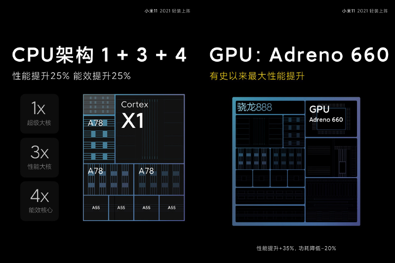 小米11 為全球首款搭載 Qualcomm Snapdragon 888 5G 行動平台、配備最高 12GB LPDDR5 RAM、256GB ROM: