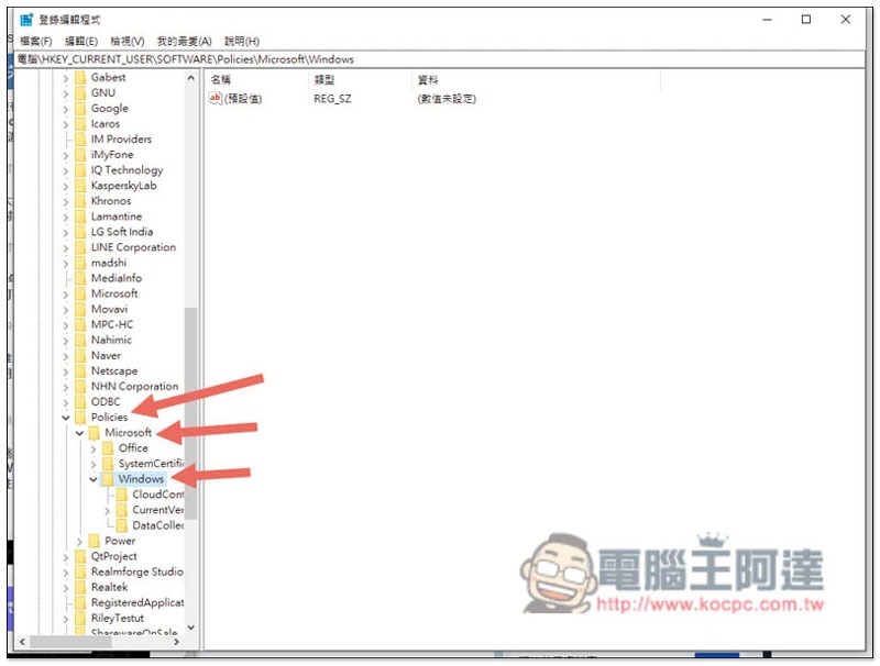 接著請進入以下路徑:HKEY_CURRENT_USER/SOFTWARE/Policies/Microsoft/Windows/