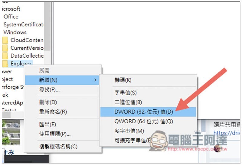 命名完成後,打開 Explorer 右鍵選單,點擊新增 –> DWORD(32-位元)值:
