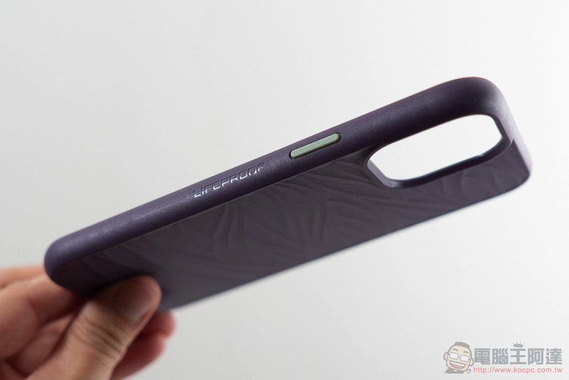 側面也有品牌的 Logo,按鈕的配色也與紫色主色調十分搭配,並採用全包覆式的按鈕設計,完整保護你手中的 iPhone: