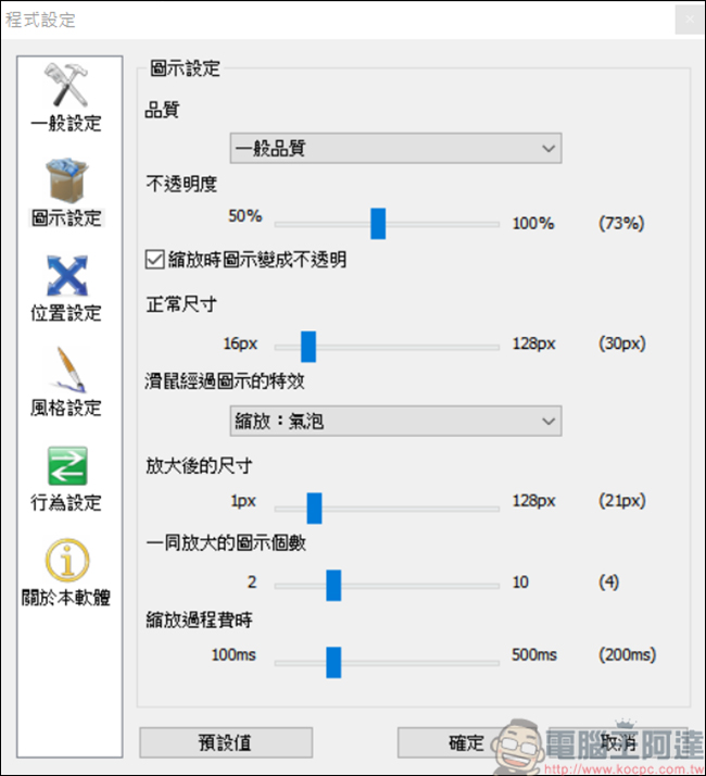 圖示設定這邊可以調整在 RocketDock 內的圖示還經過時的特效:
