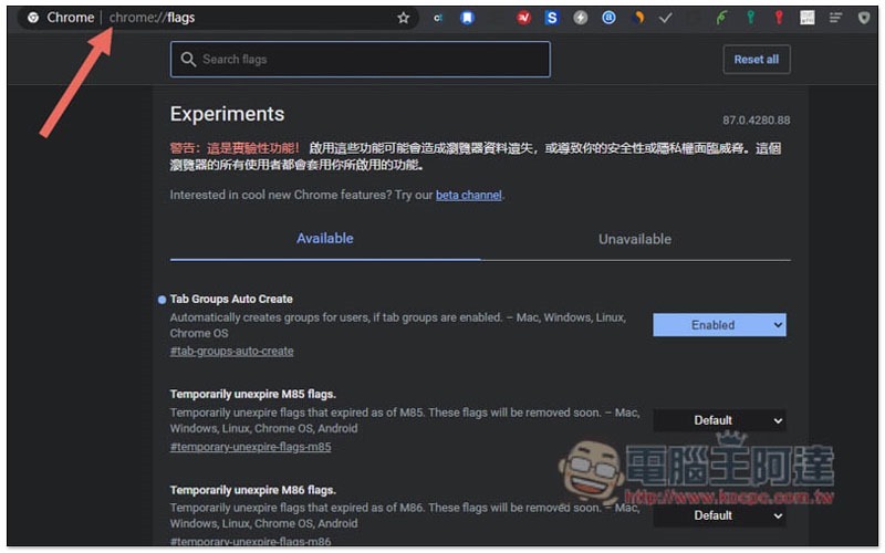 於網址列中輸入 chrome://flags/(或直接點擊也行),就會進到這頁面: