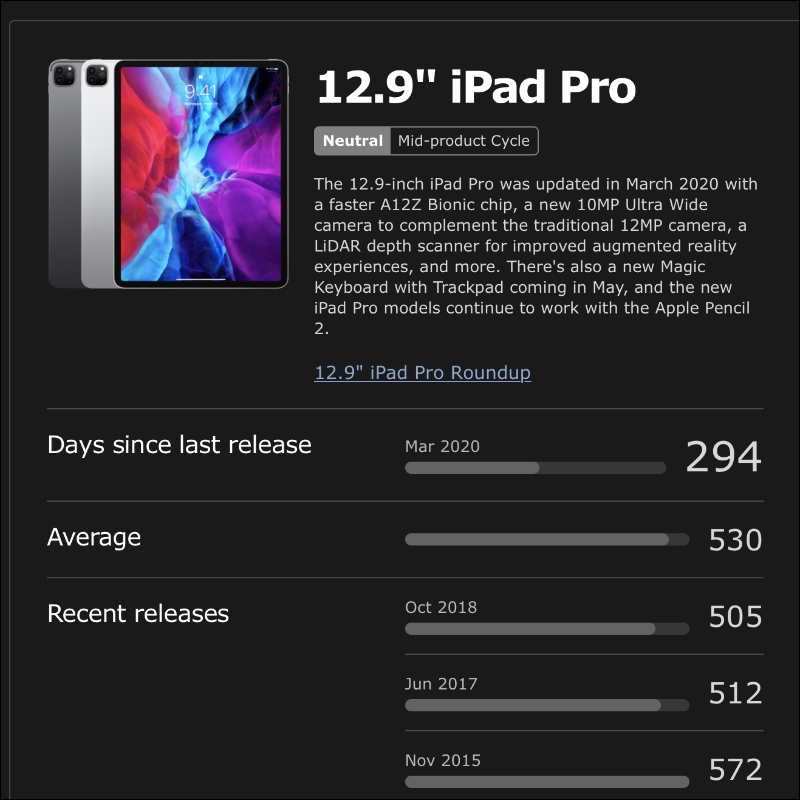 在 2020 年 3 月, Apple 推出配備雙鏡頭主相機和 LiDAR 光學雷達掃瞄儀的 iPad Pro(2020),後續不時也有傳聞在 2021 年起 Apple 將陸續為包括 iPad Pro 和 MacBook Pro 換上 Mini LED 螢幕,而在 2022 年連同 MacBook Air 也有望改用 Mini LED 。