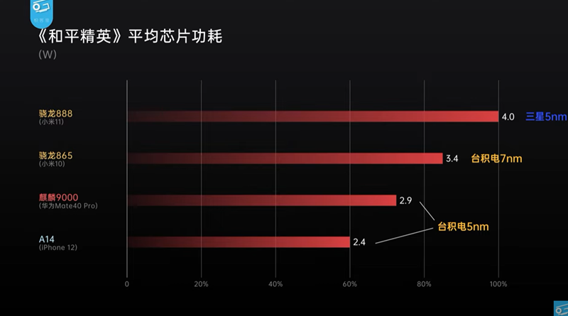 如果是玩比較不吃效能的遊戲,S888 功耗確實可以比較低一點,但依舊比 S865、麒麟9000 與 A14 還高,S865 還是採用台積電 7nm 製程: