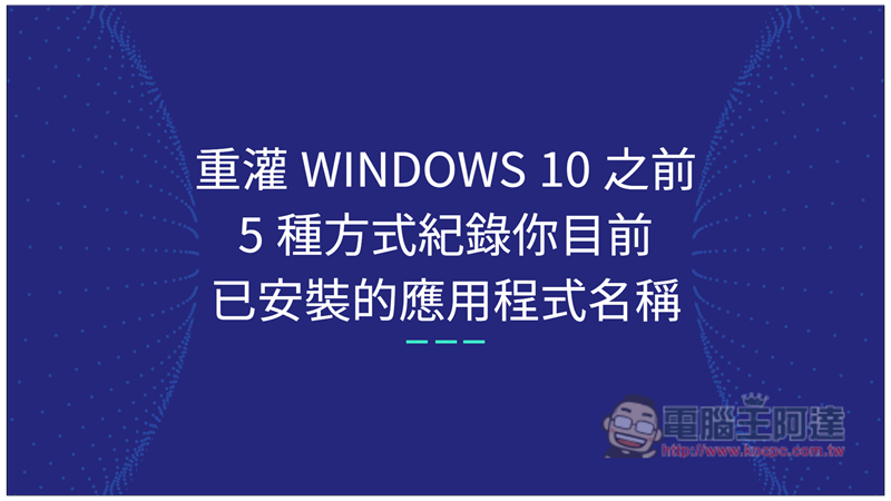 重灌電腦的 Windows 10 作業系統時,如果是想要完全乾淨的狀態,就必須整個系統都移除掉,意味著裡面儲存的檔案、已安裝應用程式都會不見,檔案靠備份就能解決,而已安裝的應用程式,很多人可能都是用紙筆或靠雲端筆記一一記下來,事實上不用這麼麻煩,這篇就要來教你 5 個可快速紀錄的方式,有 1 個甚至還能查出你軟體註冊的序號。