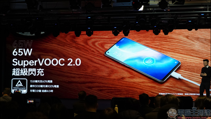 OPPO Reno5 系列全面支援 65W SuperVOOC 2.0 超級閃充技術,只需充電 5 分鐘即可追劇 4 小時、充電 15 分鐘則最高可充電至 60% , Reno5 充電至 100% 只需要 35 分鐘、 Reno5 Pro 更只需要 30 分鐘即可充滿。