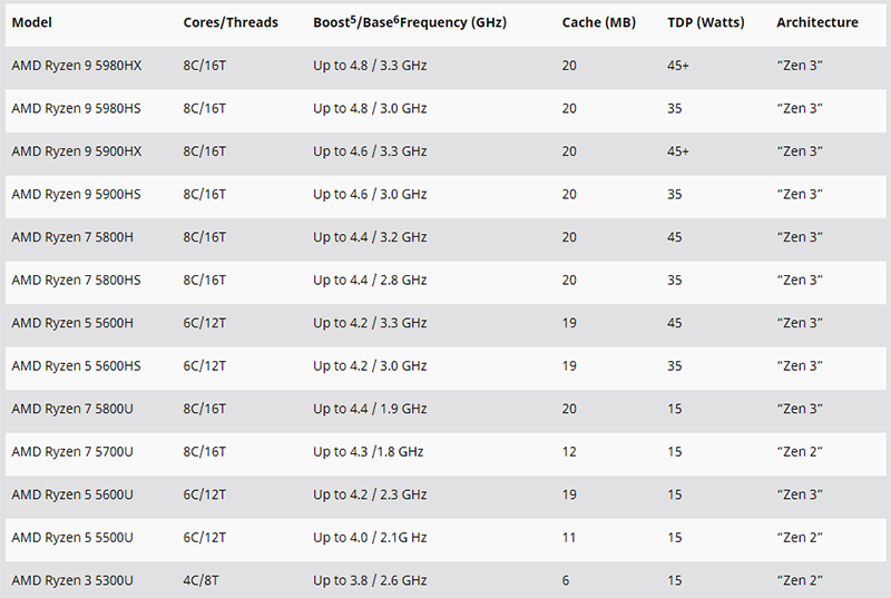 與前一代產品同樣,5000 處理器群中分成兩個類別,分別為針對遊戲與創作者筆電而生的 H 系列與適用於輕便攜帶筆電的 U 系列,在兩個類別中包含了 Ryzen 3、Ryzen 5、Ryzen 7 和 Ryzen 9 四種等級,分別對應於 Intel 的 Core i3、Core i5、Core i7 和 Core i9 的簡化版本。除了新的 HX 系列外,H 系咧中還保留了在 4000 系列中看到的 H 與 HS 後綴型號。