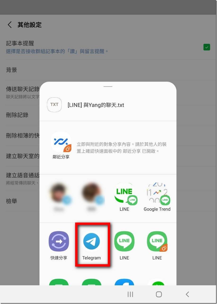 Step 04:點選之後,Android會跳出一個視窗,問你要分享到哪邊去,就點選Telegram。