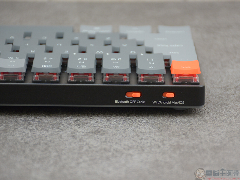 Keychron K3 的模式與連接切換開關改配在整個鍵盤的上側,並且用品牌經典螢光橘色來呈現,非常鮮明。筆者認為這次用白色字體來呈現特別清晰,目光一掃就可以看出該切換到哪一邊,比起之前用無色刻印的方式更簡單明瞭。