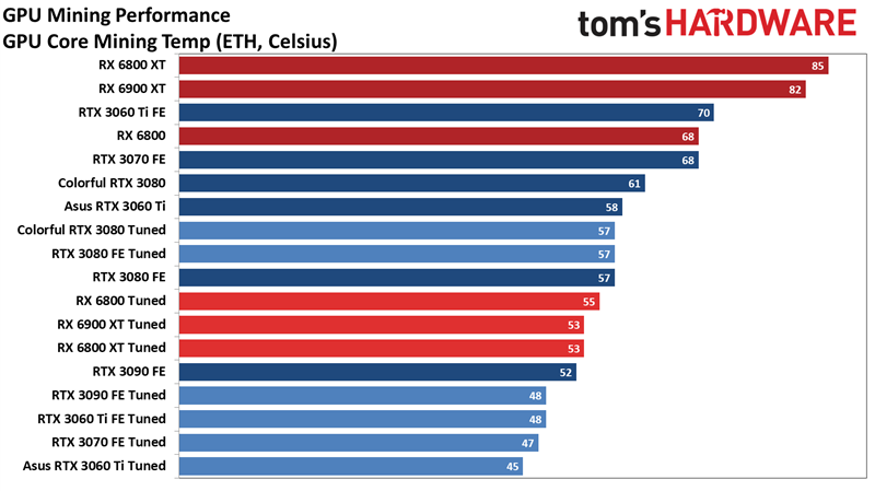 最後是挖礦溫度,AMD RX 6800XT 與 RX 6900 XT 最高,都超過 80 度,這也難怪說到挖礦,幾乎沒人在提 AMD 顯示卡:
