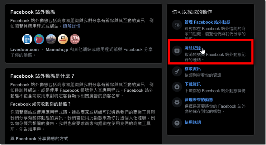 Step 10:一次全部清除固然很輕鬆,但影響太大,尤其如果你跟小編一樣,都有用FB帳號當作其他網站的帳號的話,建議還是從這開始走,首先點選「管理Facebook站外動態」。