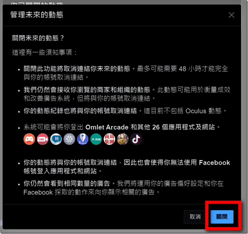 Step 13:接下來系統會提醒你,他們需要48小時來進行操作,這可能會導致你無法登入之類的,你只要確定你的帳號有準備好的話,就點選右下角的關閉就完成了。其他的網站也可以用類似的方式進行處理。