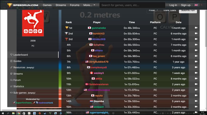 然而,即便有著這麼變態的難度,世界上仍然有些玩家仍然不斷在攻略這個遊戲。跑到終點已經不是遊戲的樂趣,反而是比別人更快跑到終點才能體現出技術的神髓。於是有心的玩家們建立起這個遊戲的 Speedrun 排行榜,甚至該遊戲的競速活動引起了金氏世界紀錄的注意,並專為該遊戲設立「最快達成百米」獎項: